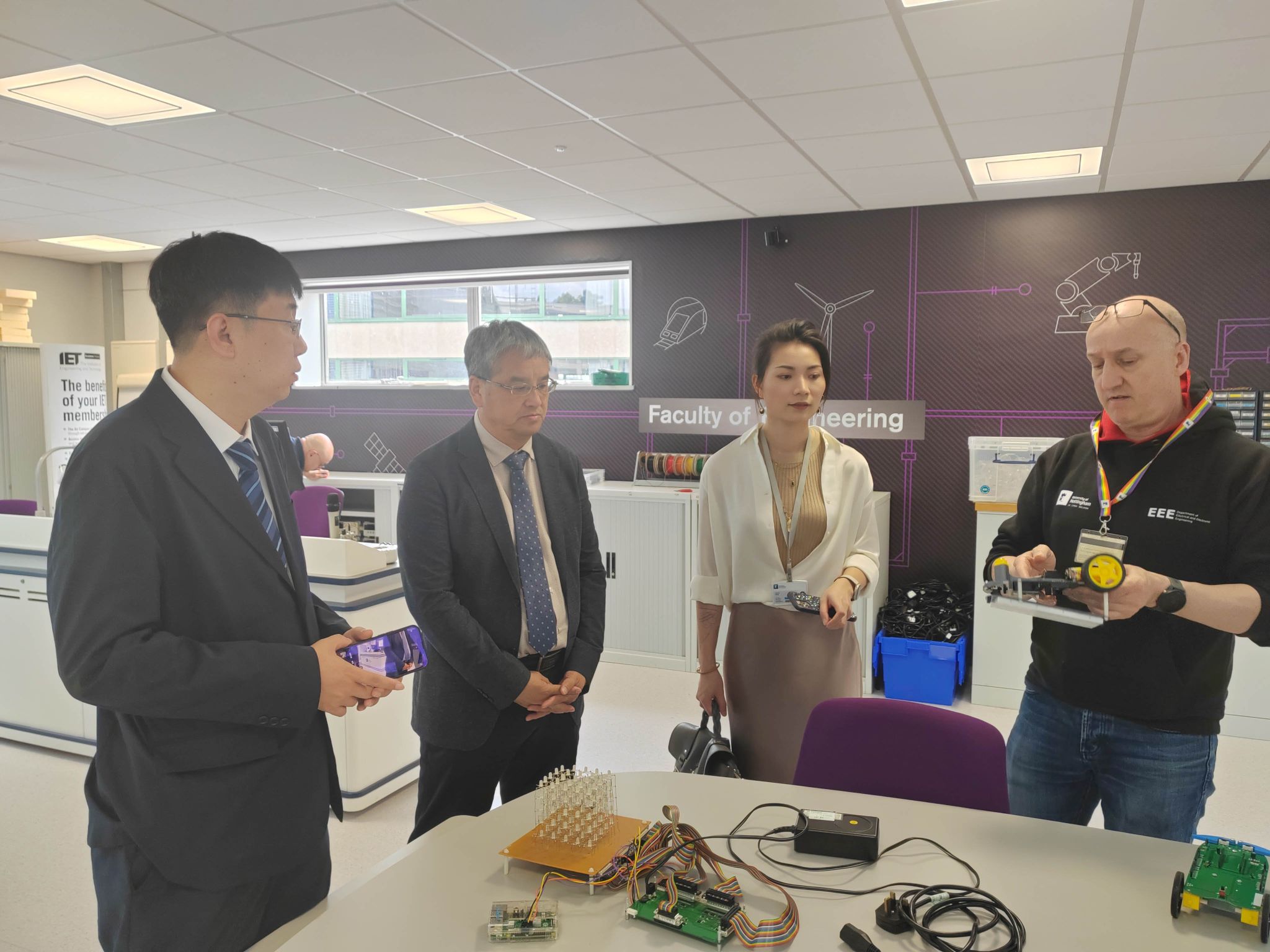 6月19日,代表团访问了英国诺丁汉大学,我校也是诺丁汉大学在中国东北地区唯一签署合作协议的高校。在商学院,学院负责人Dr Thanaset Chevapatrakul详细介绍了学院的办学历史和专业特色,双方就经管专业研究生联合培养、暑期学校等事宜展开了磋商,并决定及时跟进,尽早开展学生交流活动。在工学部,代表团实地考察了电子电器工程教学实验室,深入了解电力电子和机械中心(PEMC)的研究条件,候任的工学部负责人Dr Steve Greedy介绍了工学部的情况。双方就访问学者交流、博士生培养、合作研究等领域合作进行了详细探讨。