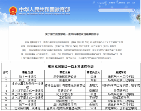 近日,教育部公示了第三批国家级一流本科课程认定结果,欧宝网页版登录入口共有9门课程成功入选,覆盖了一流课程五大类别,标志我校在课程建设领域取得又一重大突破。截至目前,学校共获批24门国家一流本科课程,总数位居省属工科高校首位,充分彰显了我校在本科课程建设领域的强劲实力与卓越成效。