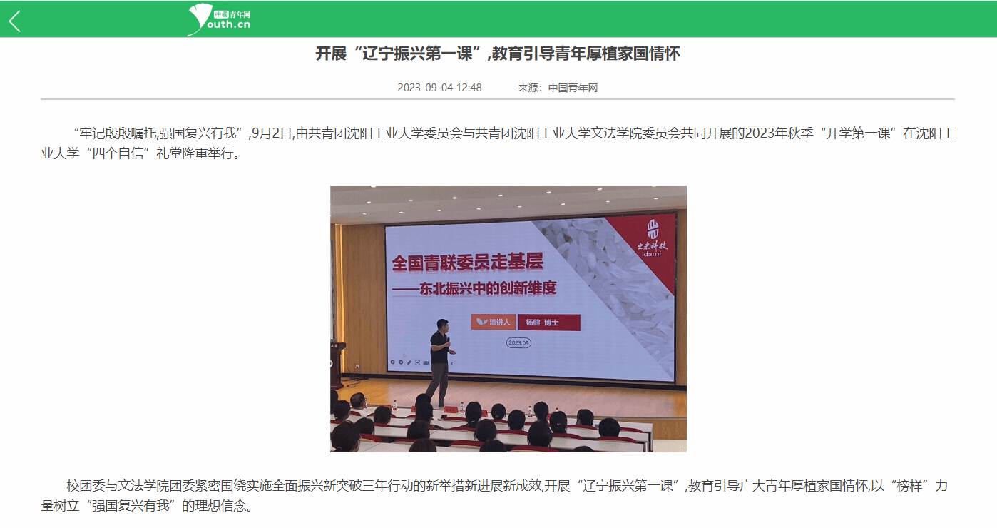 随后,主讲嘉宾杨健博士作了“全国青联委员走基层——辽宁服务振兴第一课”暨2023年秋季“开学第一课”主题报告。报告围绕大数据时代的经济模式、创新思维的构建和培养、创新创业的时代意义、青年人的责任担当4个方面展开。杨博士以自己从一名大学生成长为创业者、从一名创业者成长为创业导师、成长为辽宁省“兴辽英才计划”创业领军人才的经历,启发青年学子要树立着眼世界、着眼未来、着眼发展的广阔视野,努力成为时代发展的开拓者;树立“惟创新者进,惟创新者强,惟创新者胜”的创新思维,努力成为富有朝气、富有梦想的创新者;树立不怕苦、不怕小、不怕难的坚强信念,从“眼前事”做起,努力成为刻苦学习,脚踏实地的奋斗者;树立家国情怀、家园情怀,将国家的发展同个人的努力紧密联系在一起,努力成为“强国复兴有我”的践行者。